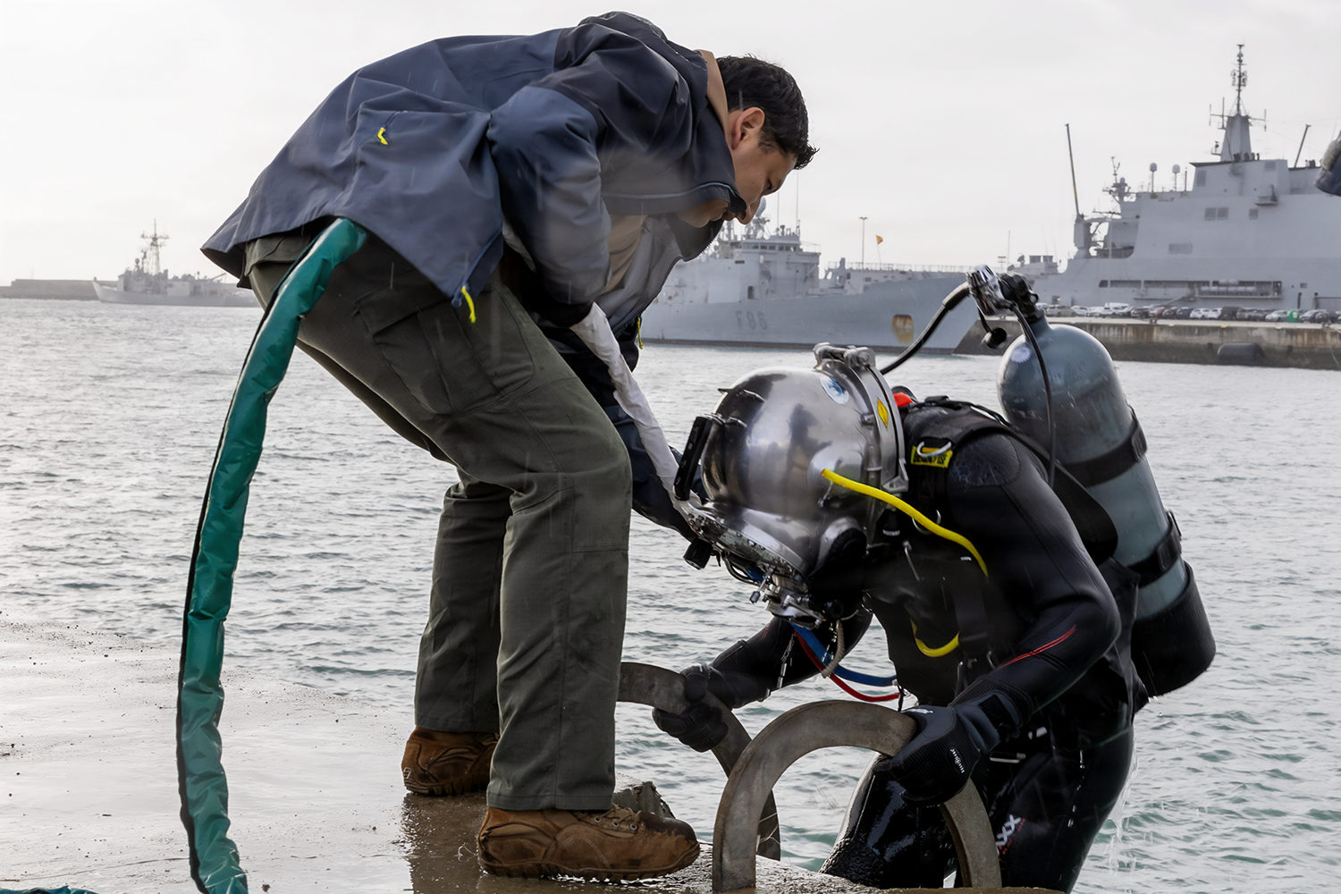 NAVAL STATION ROTA, Spain (Oct. 27, 2025) U.S. Navy Information Technician 2nd Class Anthony Moreno (left) and Builder 2nd Class Jacob Bouchard, assigned to Underwater Construction Team One (UCT-1), participate in a routine dive at Naval Station Rota, Oct. 27, 2025. UCT 1 det. Rota, currently deployed under 22nd Naval Construction Regiment, is a specially trained and equipped unit, within Navy Expeditionary Combat Forces (NECF), that specializes in diving, light salvage, underwater construction, and military engineering operations in austere environments. (U.S. Navy Photo Mass Communication Specialist Seaman by Christopher William Perez Mazuca)